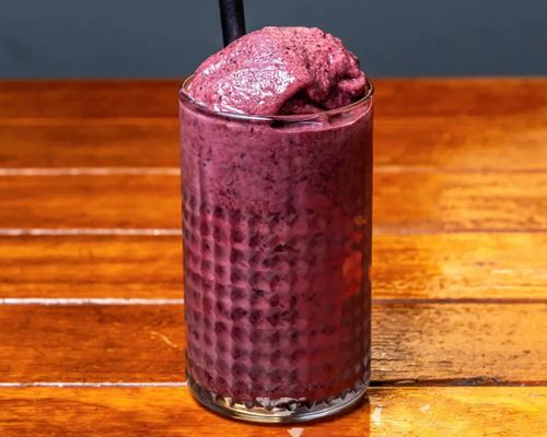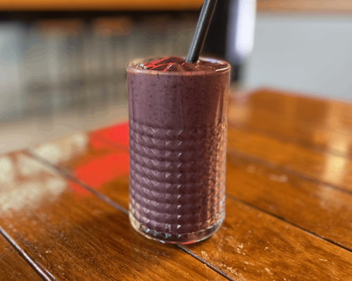 Blueberries, banana, peanut butter, cacao, maple syrup, oat milk