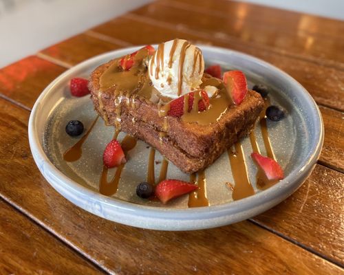 Hong Kong-inspired fried french toast, stuffed with Biscoff and cream cheese topped with vanilla ice cream, Biscoff sauce and fresh fruit