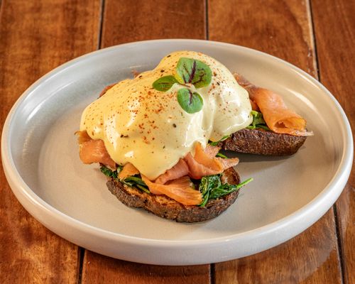 Two poached eggs atop your choice of crispy bacon, ham, or smoked salmon, layered over wilted spinach and Sonoma sourdough. Finished with a rich hollandaise sauce.