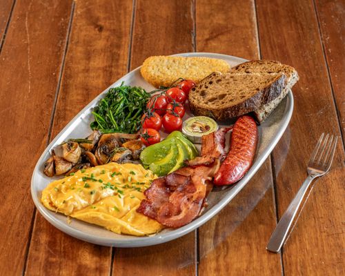 One of our signature dishes, featuring two eggs your way, crispy bacon, double smoked Kransky sausage, sautéed mushrooms, spinach and cherry tomatoes, avocado, a hash brown, Sonoma sourdough and Pepe Saya cultured butter.