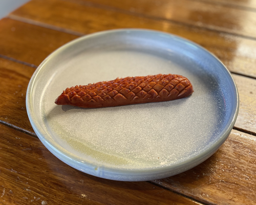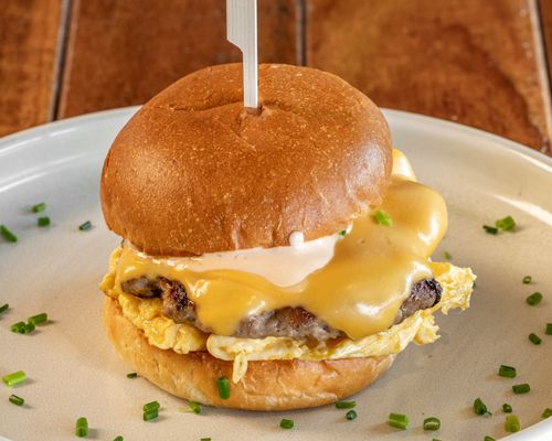 Homemade spiced sausage patty, folded eggs, cheddar cheese and sriracha mayo on a soft brioche bun.