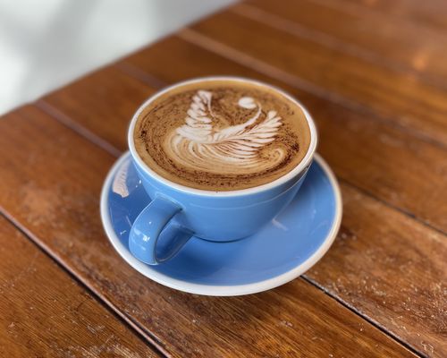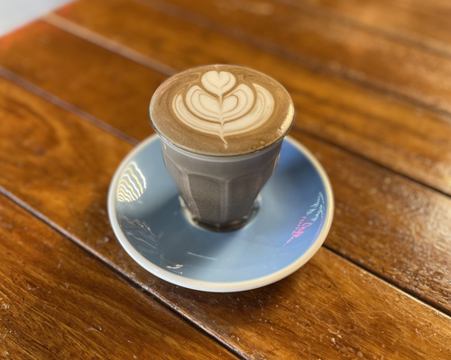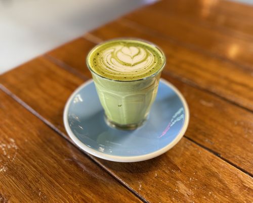 Hojicha latte made with 100% premium roasted green tea from Kyoto, your choice of steamed milk, and naturally sweetened with honey for a smooth, toasty and nutty flavour.