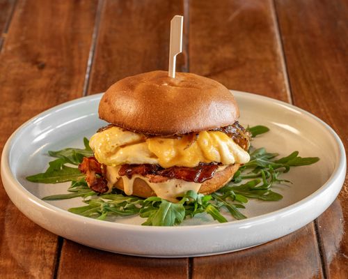 Choose from our Signature Bacon & Egg Roll, featuring crispy bacon, folded eggs, melted cheese, BBQ sauce, Sriracha mayo, and sweet onion jam, or our Classic Bacon & Egg Roll, served with crispy bacon, fried eggs, and BBQ sauce.