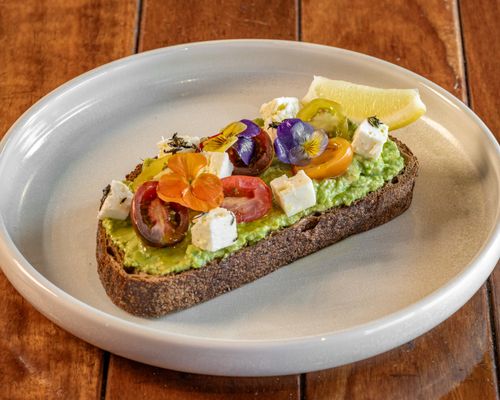 Freshly smashed avocados on Sonoma sourdough, topped with poached eggs and dukkah or tomatoes and feta.