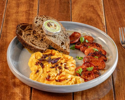 Soft scrambled eggs, topped with crispy chilli oil, served with Sonoma sourdough, Pepe Saya butter and your choice of Chorizo or Avocado