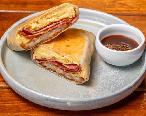 A crowd favourite, crispy bacon, hash brown, scrambled eggs, your choice of sauce in a toasted wrap.